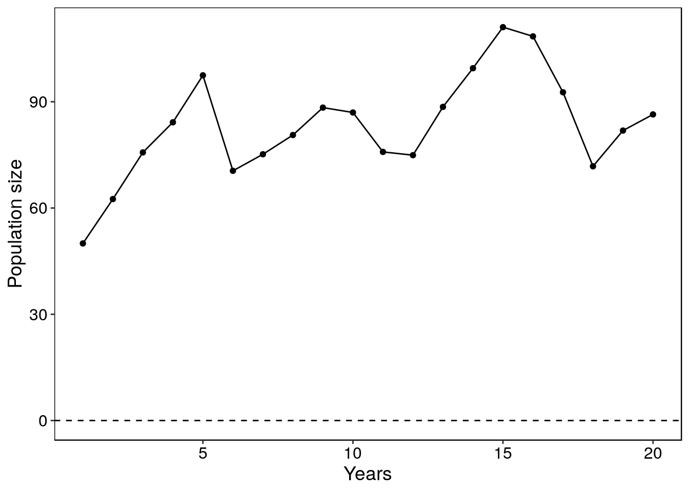 The basic idea here is that populations can vary in their growth rates based on the number of births and the number of individuals which survive to the following year. In the previous practical we modelled populations with fixed growth rates but it is very unlikely that the population would grow consistantly according to that rate every year. Factors that influence demographic stochasticity might be the chances of locating and successfully attracting a mate, arriving at a breeding location and establishing a territory, carrying the offspring to term, having a successful birthing or hatching process - the list could go on. A large proportion of the ecological modelling literature has focusssed on the effect of population sizes and stochastic processes as this has major conservation implications. In today’s practical we will be investigating the the impact of stochastistic processes on varying population sizes.